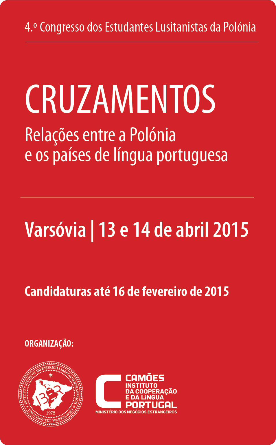 A representação do Camões I.P. em Varsóvia e o Instituto de Estudos Ibéricos e Ibero-americanos da Universidade de Varsóvia tornam pública a chamada para comunicações do 4.º Congresso dos Estudantes Lusitanistas da Polónia, dedicado ao tema “Cruzamentos: relações entre a Polónia e os países de língua portuguesa”. A iniciativa irá decorrer nos dias 13 e 14 de abril de 2015 na Universidade de Varsóvia.